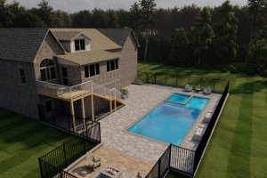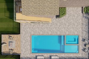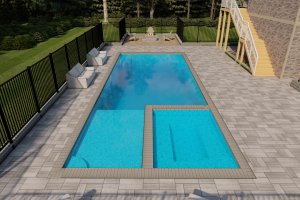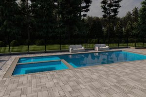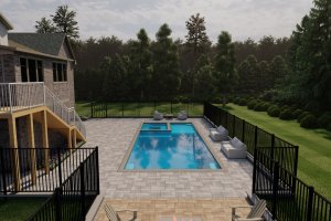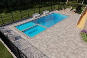 Taken from an elevated position (like the deck), this shot gives a comprehensive overview of the main pool and spa area, showing the full expanse of the grey paver patio and the surrounding fence line.
