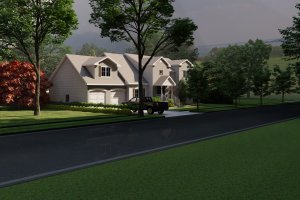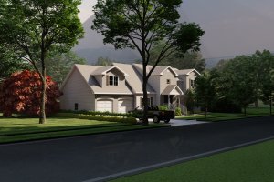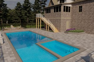 A close-up view from the patio, highlighting the relationship between the house, the wooden deck stairs, and the attached spa. This angle showcases the brick and paver materials.