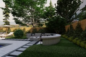 This view highlights the separate, dedicated fire pit area. It features different (tan/beige) pavers, creating a distinct 'room' within the backyard, while still overlooking the main pool.