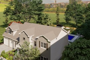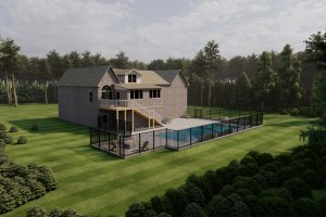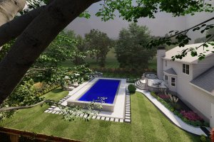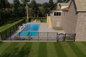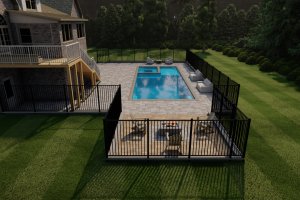 This 'blueprint' view shows the entire backyard layout, including the pool's position relative to the house, the complete fence line, and the separate fire pit area. Ideal for understanding space and flow.